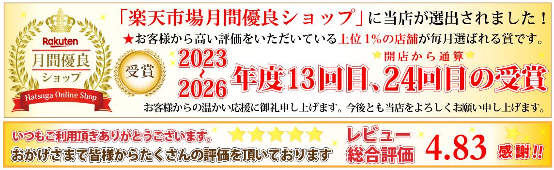 はつが公式オンラインショップ 楽天市場店がユーザーから高い評価を得た上位1%の店舗として2026年1月度月間優良ショップに選ばれました (3,073件のレビュー平均4.83)。2023~2026年度23回目の受賞になります。これからもみなさまの美容と健康に必ず役立つ当社のこだわり製品とこれからの健康生活に必要な最新情報を提供して参ります。 今後ともどうぞよろしくお願い申し上げます。 |